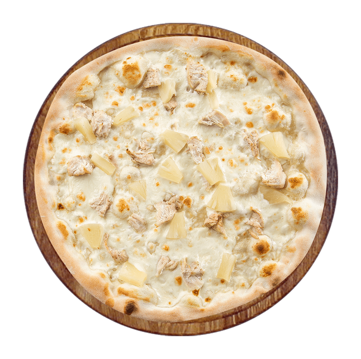 Crème fraîche, fromage, sauce curry, poulet, tomates fraîches, poivrons.