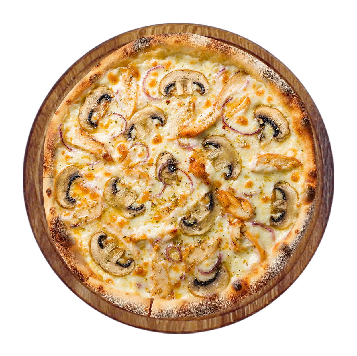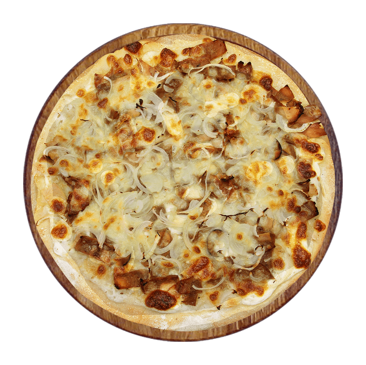 Crème fraîche, fromage, sauce curry, émincé de poulet, jambon, champignons,.