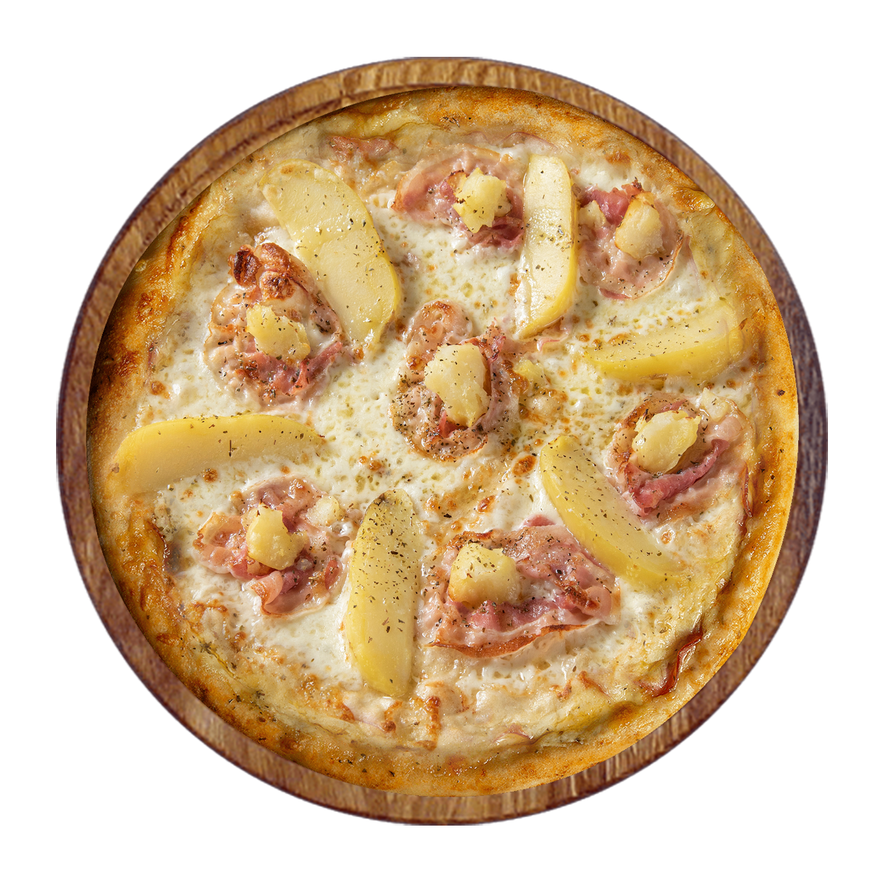 Crème fraîche, fromage, lardons, oignons, camembert, pommes de terre.