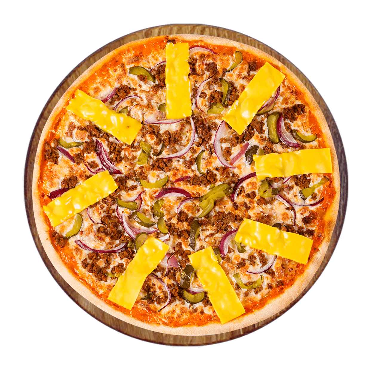 Sauce barbecue, fromage, viande hachée, oignons, poivrons.